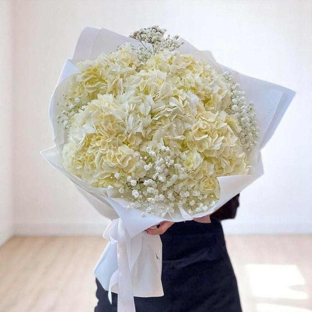 Букет White Cloud — это воздушная композиция из 8 пышных белых гортензий, деликатно обрамлённых мягкой гипсофилой (baby's breath) и завернутых в безупречно белую бумагу с подходящей атласной лентой. Этот роскошный букет вызывает ощущение чистоты, элегантности и спокойствия – идеально подходит для выражения сочувствия, восхищения или вечного романтического жеста. Будь то день рождения, романтический сюрприз или просто посыл тёплых пожеланий, эта воздушная и элегантная композиция заставит сердца сиять. Инструкции по уходу: Чтобы букет дольше оставался свежим, перед помещением в холодную воду срежьте стебли под углом острым ножом или садовыми секаторами. Меняйте воду ежедневно и слегка подрезайте стебли. Держите букет вдали от прямых солнечных лучей, обогревателей и сквозняков. Более прохладная среда поможет сохранить красоту цветов.