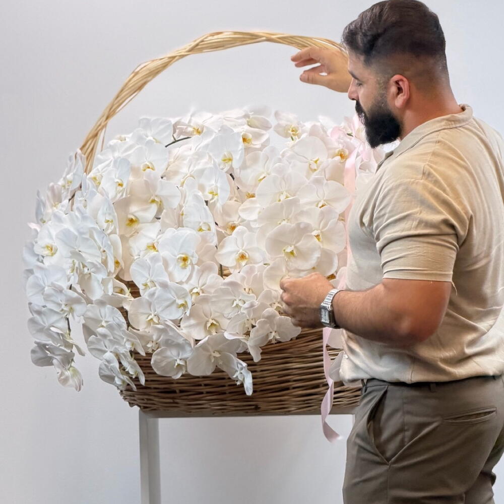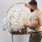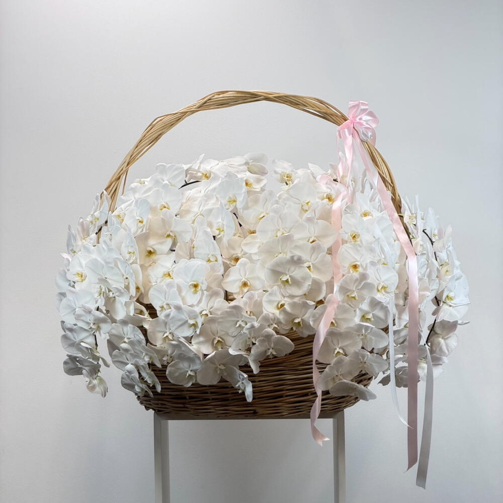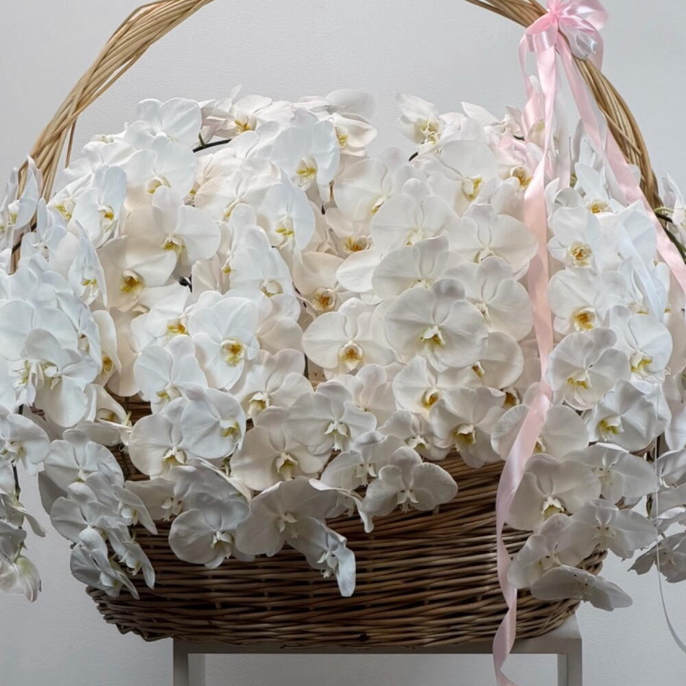 Роскошный каскад белых орхидей фаленопсис в плетёной корзине ручной работы, украшенный нежно-розовыми лентами. Элегантный, неподвластный времени и идеальный для свадеб, годовщин и изысканных подарков. 🤍