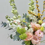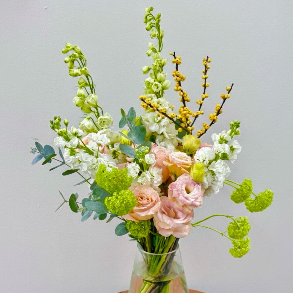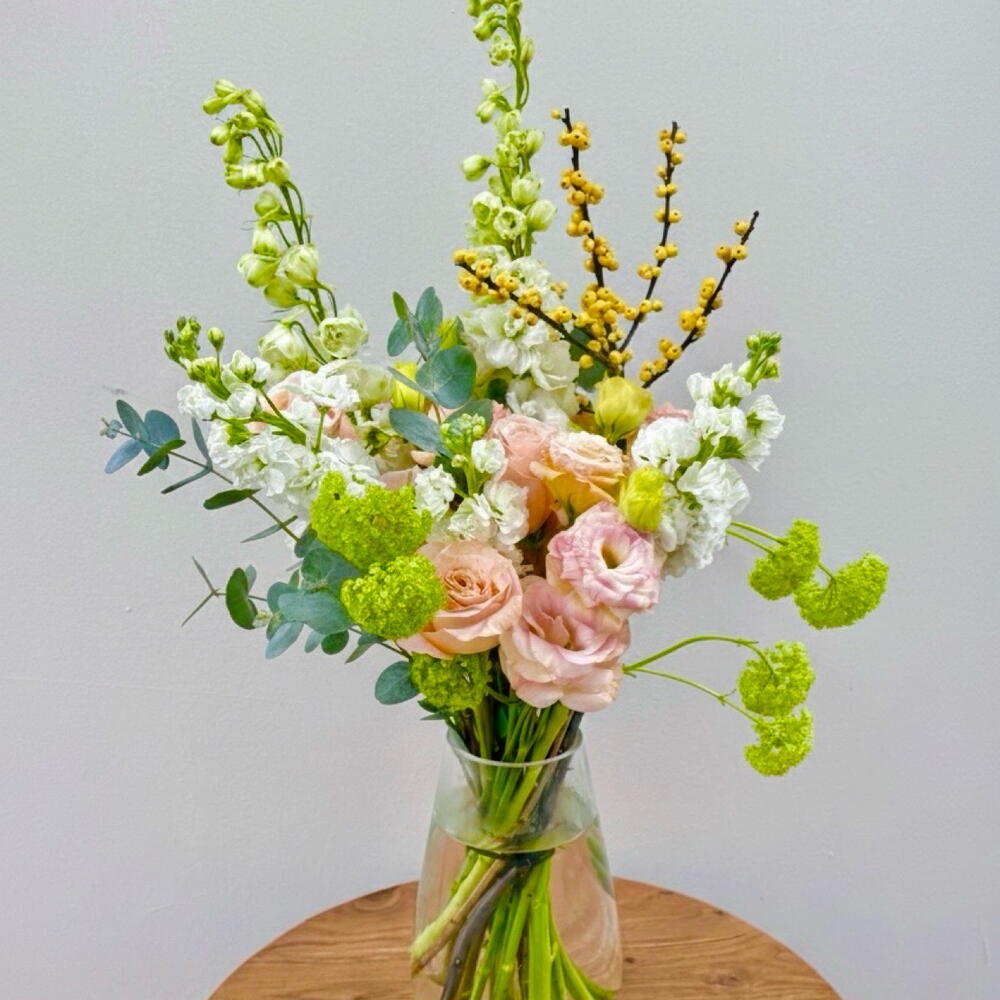 Eucalyptus - 5 шт. delphinium white - 2 шт. белая маттиола - 5 шт. лизиантус персиковый - 4 шт. зелёный вибурнум - 3 шт. shimmer rose - 4 шт. илекс желтый - 1 шт.