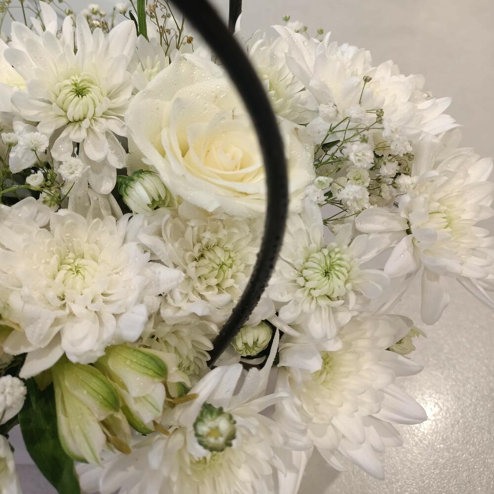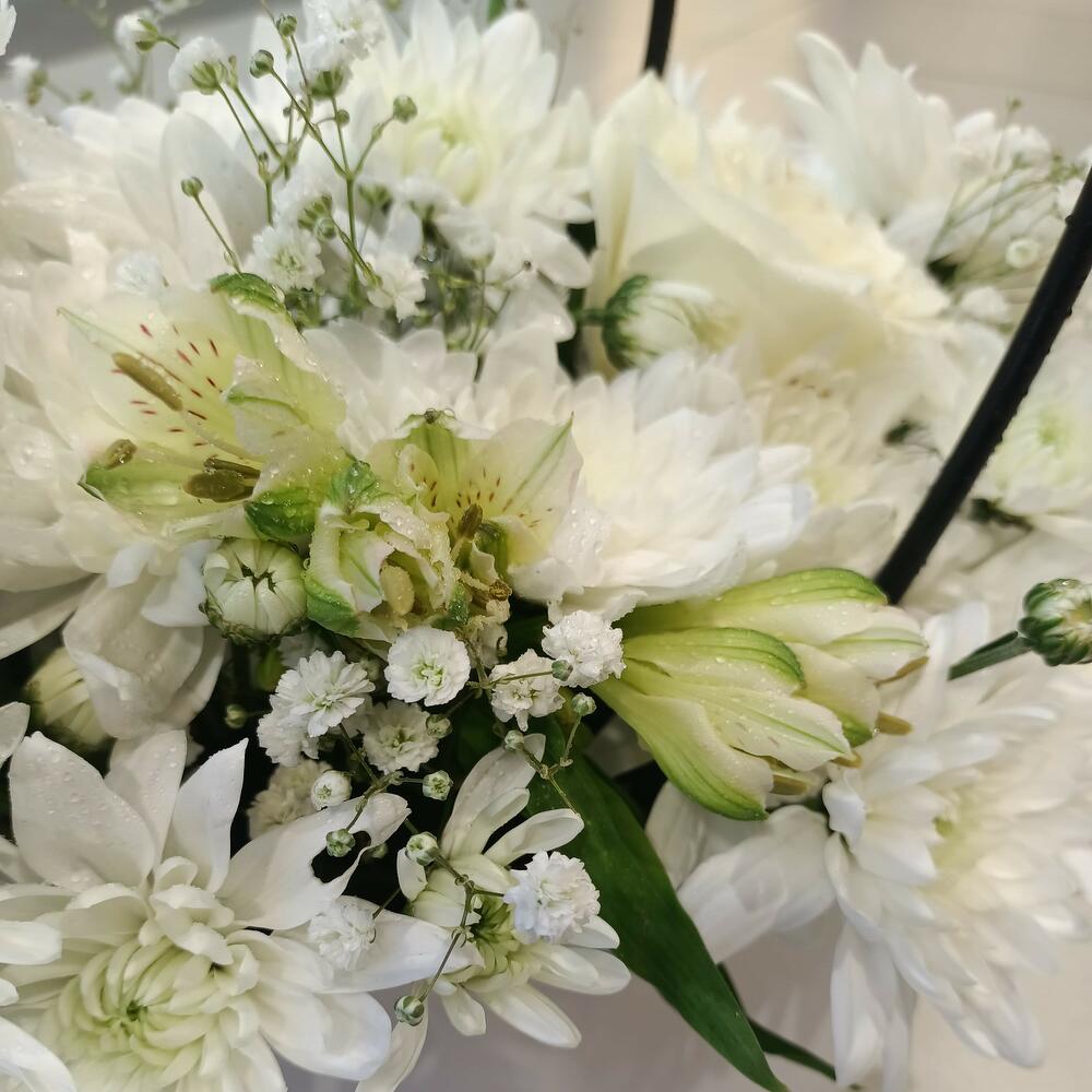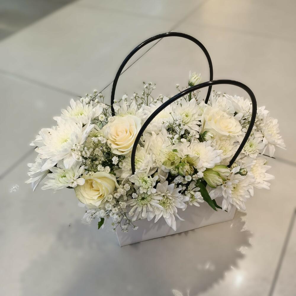 Изысканная цветочная композиция, представленная в изящной белой прямоугольной коробке с современными чёрными петлевыми ручками. В ней — обилие безупречно белых цветов, включая элегантные розы, пышные хризантемы и нежную гипсофилу, что делает её классическим и умиротворяющим подарком, идеальным для любого случая.