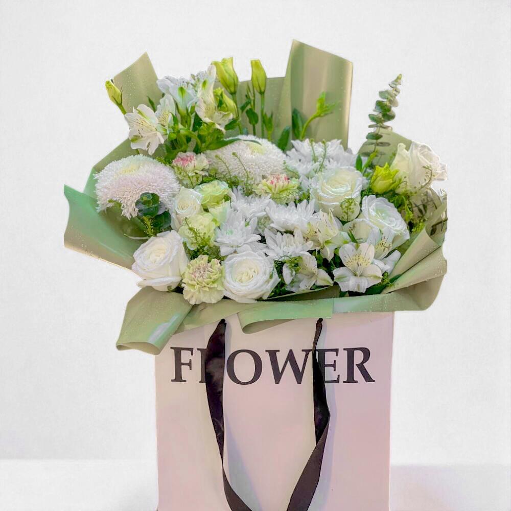 Эта нежная цветочная композиция в мягких белых и кремовых тонах добавит нотку элегантности и спокойствия в любое пространство. Букет передаёт легкость и чистоту, делая его идеальным подарком к празднику, в знак благодарности или просто чтобы сделать чей-то день светлее. Оформленный в стильном цветочном пакете с флористической губкой, пропитанной водой, внутри, он сохраняет цветы свежими и яркими. Чтобы продлить жизнь букета, добавляйте воду в губку каждые 1–2 дня и держите его вдали от прямых солнечных лучей и сквозняков. Идеальный для особых моментов, таких как дни рождения, годовщины или любой душевный повод, этот цветочный букет выходит за рамки обыденного и становится осязаемым воплощением любви. Отправьте его в подарок на день рождения, выразите поздравления с годовщиной, передайте пожелания скорейшего выздоровления или просто подарите кому-то дорогому мгновение любви.