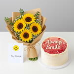Sunflower - 4 шт. Gypsophila - 5 шт. postcard - 1 шт. cake - 1000 гр.