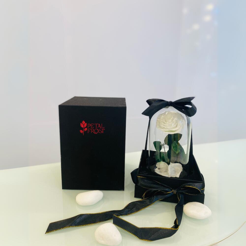 Сохранённая белая роза «Forever Rose», изящно размещённая под прозрачным куполом и дополненная классической чёрной подарочной коробкой. Символизируя чистоту, вечную любовь и вневременную элегантность, это роскошное изделие идеально подходит для свадеб, годовщин или значимых подарков, которые сохраняются навсегда.