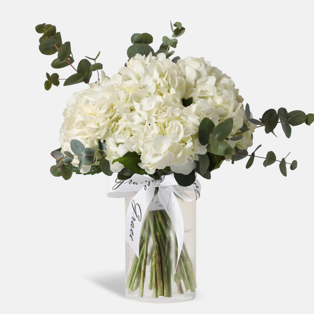 Преобразите любое пространство этой элегантной композицией белых гортензий в стильной вазе, дополненной свежим эвкалиптом. Мягкие, пышные соцветия в сочетании с тонким ароматом эвкалипта создают спокойную и изысканную атмосферу, идеальную для подарка, домашнего декора или особых случаев, принося вечную красоту и очарование в любое окружение.