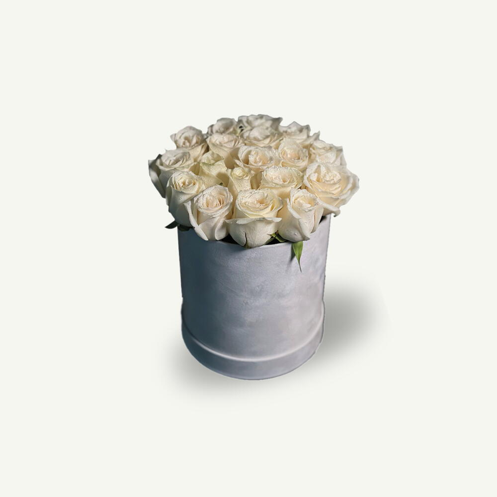 Изысканная композиция из 15–20 свежих белых роз, аккуратно оформленная в белой бархатной коробке для элегантной и неподвластной времени презентации.