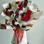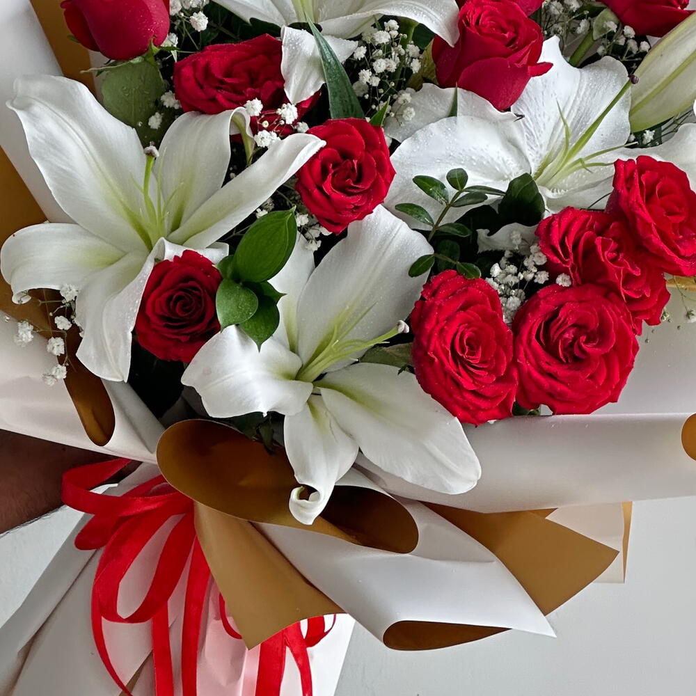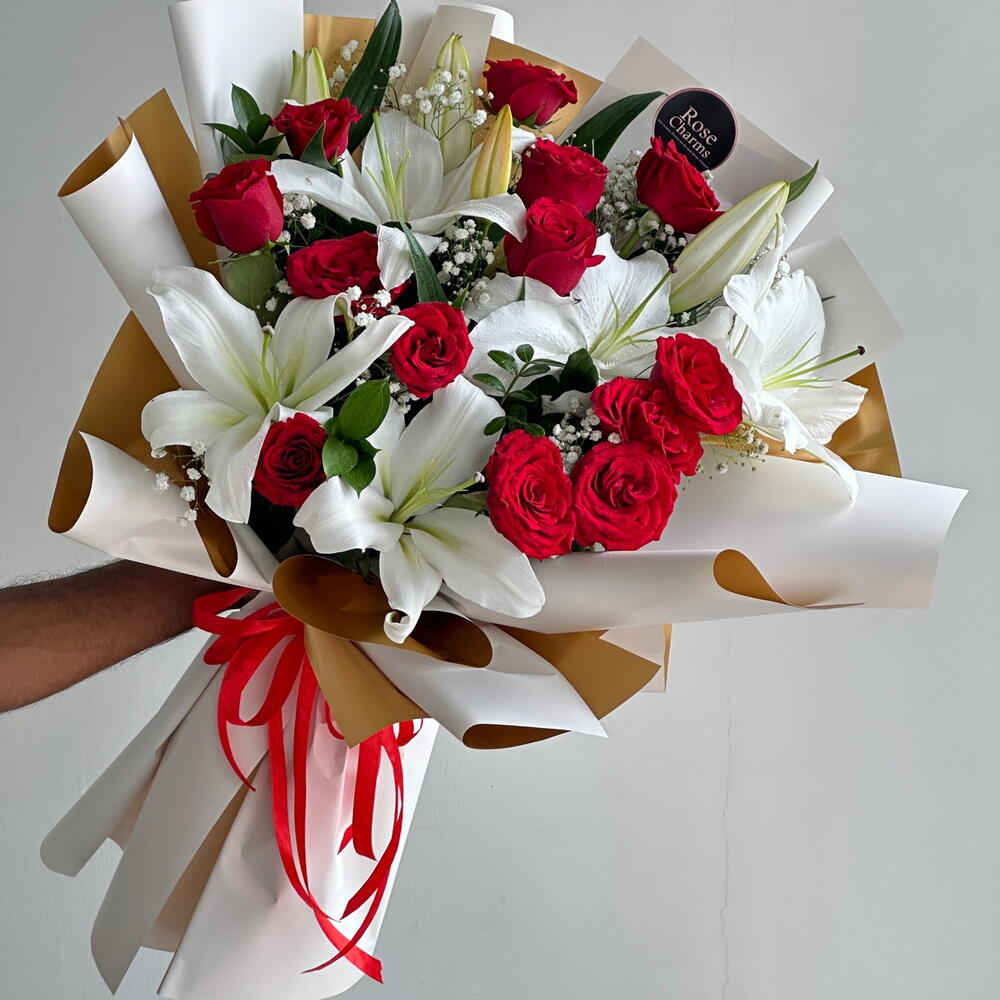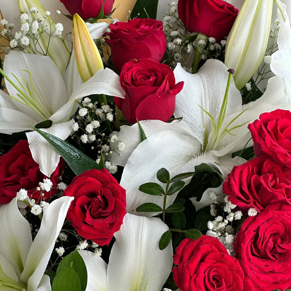 Сделайте роскошный, незабываемый жест с этим роскошным букетом из 15 насыщенно-красных роз в сочетании с 4 белоснежными лилиями. Дополненная нежными гипсофилами и элегантно упакованная в подарочную коробку с лентами премиум-класса, эта композиция уверенно и изящно говорит о любви. Насыщенно-красные розы выражают страсть и преданность, а белые лилии добавляют чистоту, гармонию и непреходящую красоту. Вместе они создают классический, но в то же время яркий букет — идеальный для годовщин, романтических сюрпризов, извинений или любого другого момента, который заслуживает чего-то по-настоящему значимого. Создан, чтобы впечатлять, доведен до совершенства и создан, чтобы трогать сердца. Скажите это с элегантностью — закажите этот потрясающий букет из роз и лилий сегодня и сделайте свое послание незабываемым.