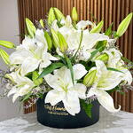 Композиция из 6 белых лилий с лимониумом и зеленью в чёрной коробке