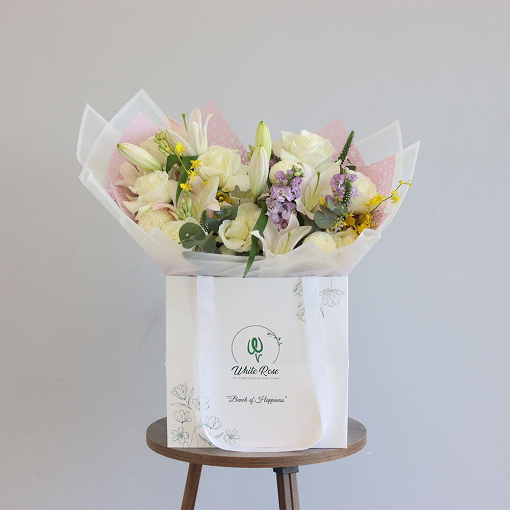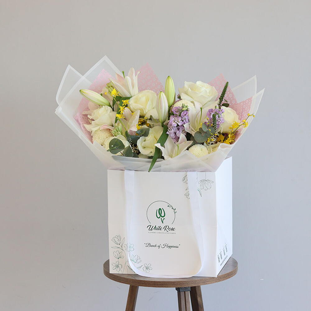 Букет из лилий, роз, танцующей леди и других цветов, оформленный в сумке.