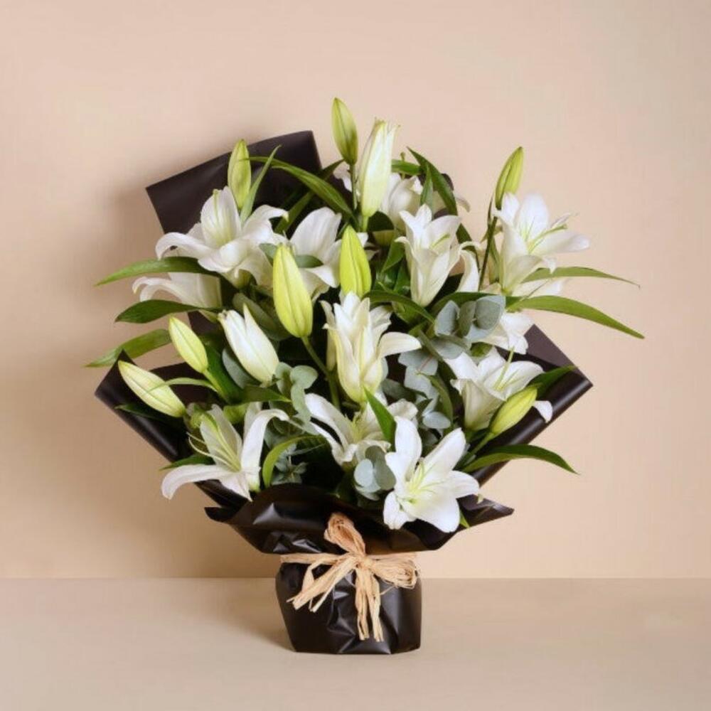 Изящный и неподвластный времени, этот элегантный букет белых лилий передает чистоту, восхищение и спокойствие. Красиво упакованный в шикарную черную бумагу с деревенским бантом из бечевки, он станет изысканным подарком на любой случай — будь то искреннее сочувствие, поздравительный жест или романтический сюрприз. Аромат лилий мягко наполняет пространство, создавая безмятежную и воодушевляющую атмосферу. Чтобы букет дольше оставался свежим, поместите его в прохладную чистую воду и подрезайте стебли каждые 2–3 дня. Держите цветы вдали от прямых солнечных лучей, обогревателей и спелых фруктов. Идеально подходящий для особых моментов, таких как дни рождения, годовщины или любые другие трогательные события, этот цветочный букет выходит за рамки обыденности и становится осязаемым проявлением любви. Подарите его на день рождения, выразите пожелания скорейшего выздоровления или просто пожелайте дорогому человеку момент любви.