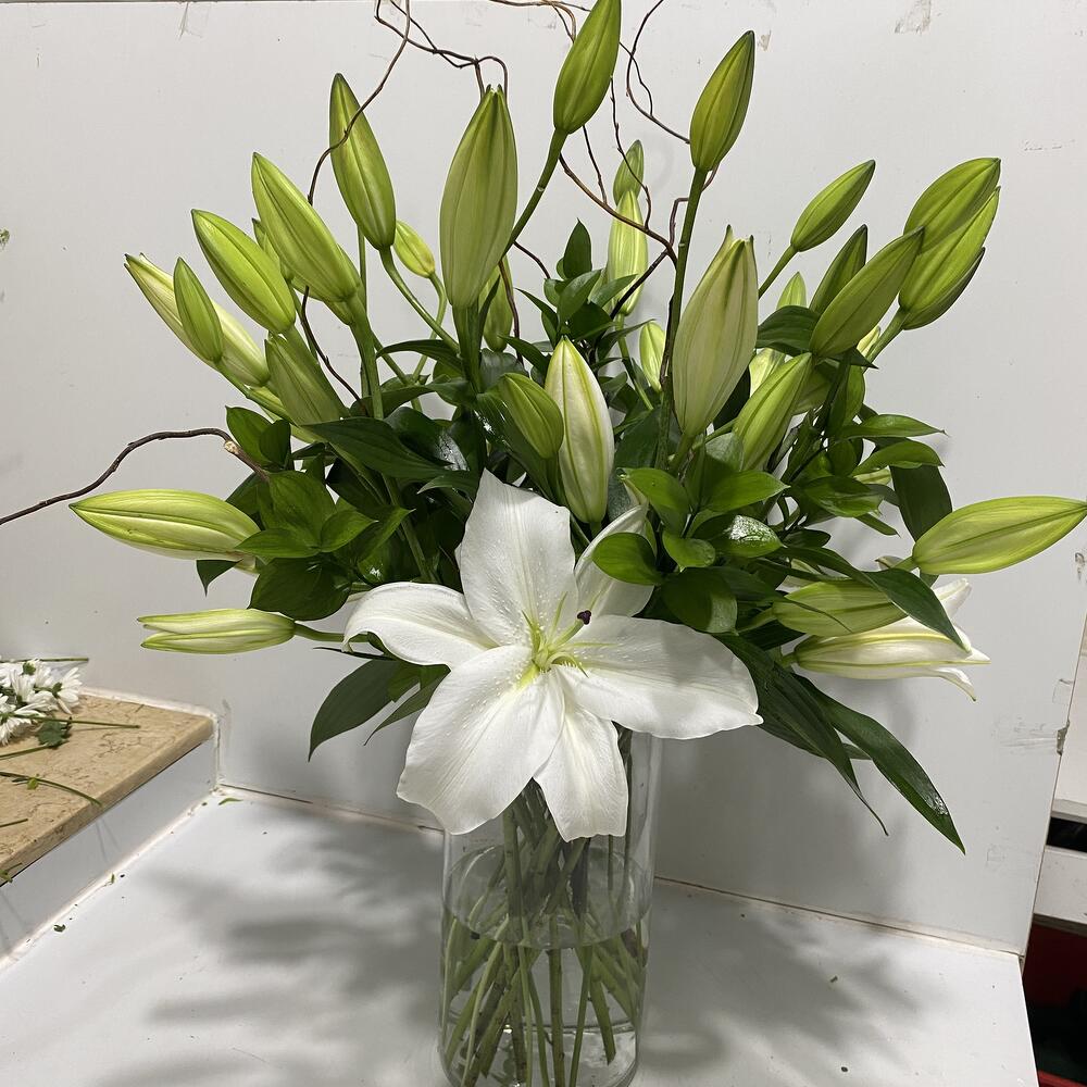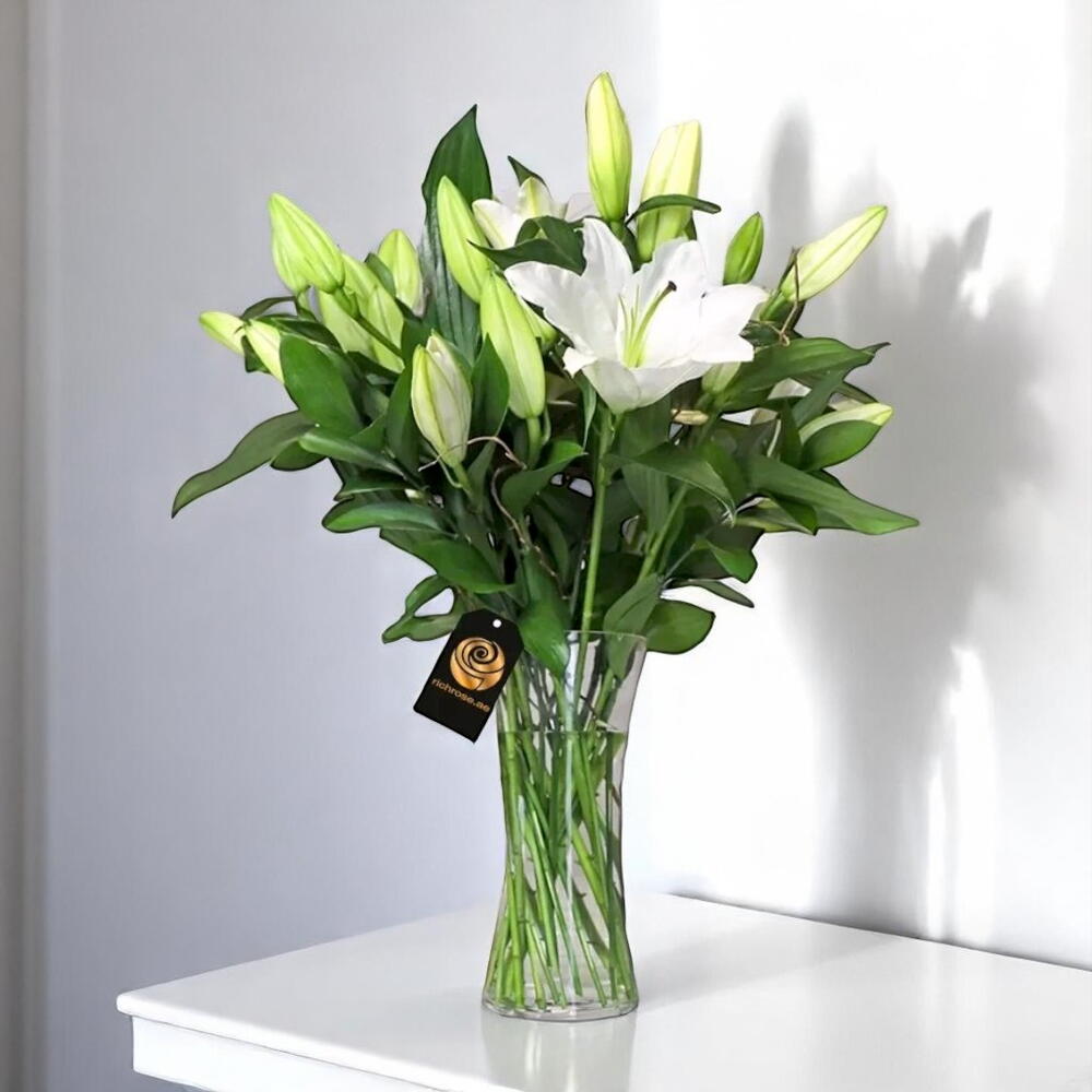 Изысканный и элегантный, этот букет белых лилий — символ чистоты и утончённости. Оформлённый в прозрачной стеклянной вазе, он приносит в любой интерьер нотку умиротворения и красоты. Идеально подходит для дней рождения, юбилеев или в качестве значимого жеста: эти цветы наполняют комнату нежным, сладким ароматом. Чтобы лилии дольше оставались свежими, ставьте их в прохладное место, вдали от прямых солнечных лучей и сквозняков. Меняйте воду каждые 2 дня и подрезайте стебли под углом, чтобы они лучше впитывали воду.
