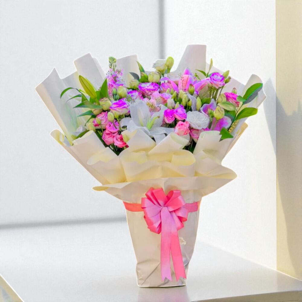 Подарите радость и лёгкость с этим очаровательным пастельным букетом, созданным, чтобы озарить любой день. Нежные оттенки розового, лавандового и белого создают деликатный и романтичный образ, идеально подходящий для дней рождения, праздников или просто чтобы сказать «спасибо». Упакованный в кремово-белую бумагу с нежным розовым бантом, этот букет излучает элегантность и тепло. Каждый цветок тщательно отобран, чтобы обеспечить свежесть и красоту. Чтобы ваш букет дольше оставался свежим, ежедневно меняйте воду, слегка подрезайте стебли каждые два дня и держите его подальше от прямых солнечных лучей и тепла. Удаляйте любые листья, погружённые в воду, чтобы предотвратить рост бактерий. Наслаждайтесь красотой и нежным ароматом до 7 дней при правильном уходе. Идеально для особых моментов, таких как дни рождения, годовщины или любой искренний повод, этот цветочный букет превосходит обыденное и становится осязаемым воплощением любви. Отправьте его в подарок на день рождения, выразите поздравления с годовщиной, передайте пожелания скорейшего выздоровления или просто пожелайте кому-то дорогому мгновение любви.