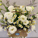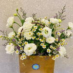 white lisianthus - 7 шт. лимониум пурпурный - 4 шт. коричневая сумка - 1 шт. daisy tanacetum - 3 шт.