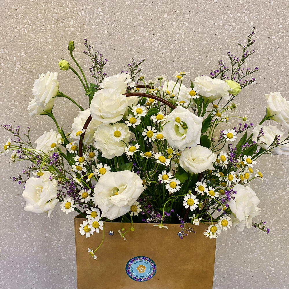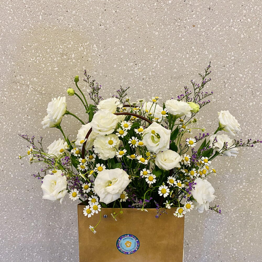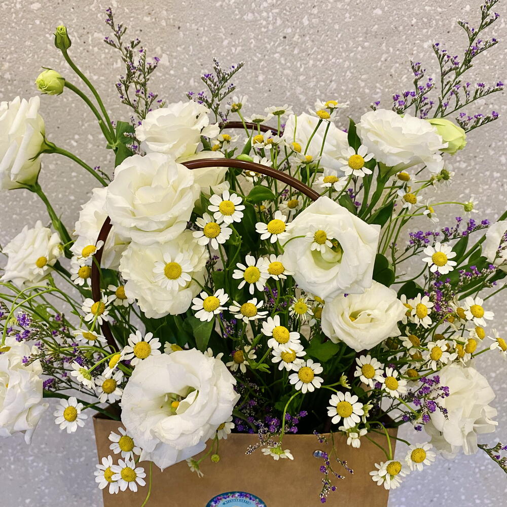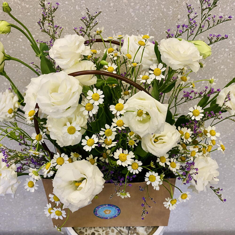 white lisianthus - 7 шт. лимониум пурпурный - 4 шт. коричневая сумка - 1 шт. daisy tanacetum - 3 шт.