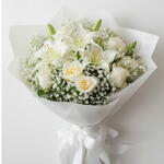 «White Majesty» — воплощение элегантности и изящества. Этот букет сочетает в себе 10 свежих белых роз, 4 безупречные белые лилии и нежные гипсофилы, создавая изысканную композицию, символизирующую чистоту и восхищение. Букет вручную упакован в высококачественную белую бумагу и украшен лентой.