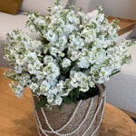 Роскошная и изысканная цветочная корзина, демонстрирующая премиальные белые цветки маттиолы, уложенные в нежное облако нежности. Эта элегантная корзина White Meadow, украшенная жемчужным декором, является вечным символом чистоты, искренности и непреходящей красоты — идеальный подарок для свадеб, дней рождения или корпоративного признания. Большой размер - 70 маттиол