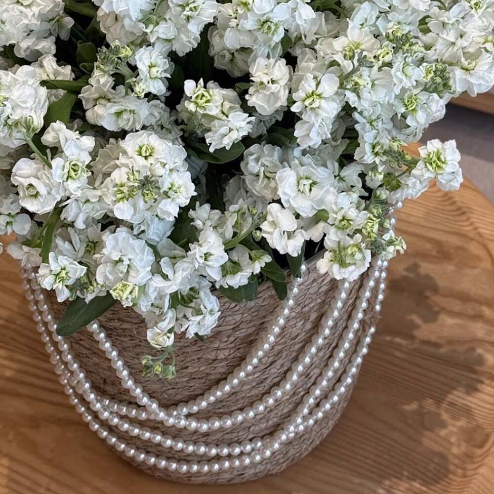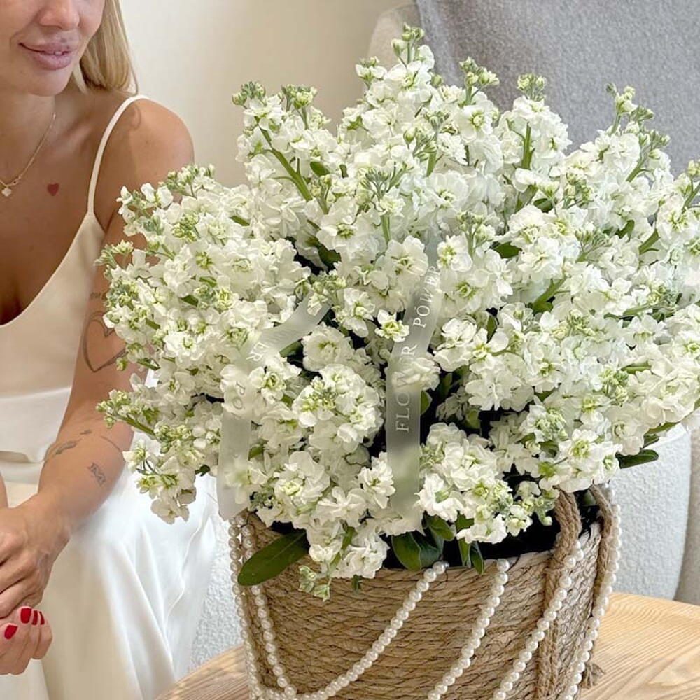 Роскошная и изысканная цветочная корзина, демонстрирующая премиальные белые цветки маттиолы, уложенные в нежное облако нежности. Эта элегантная корзина White Meadow, украшенная жемчужным декором, является вечным символом чистоты, искренности и непреходящей красоты — идеальный подарок для свадеб, дней рождения или корпоративного признания. Большой размер - 70 маттиол