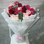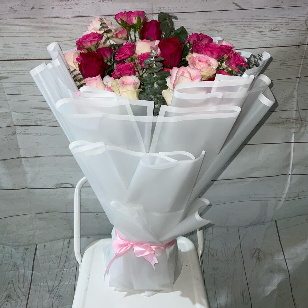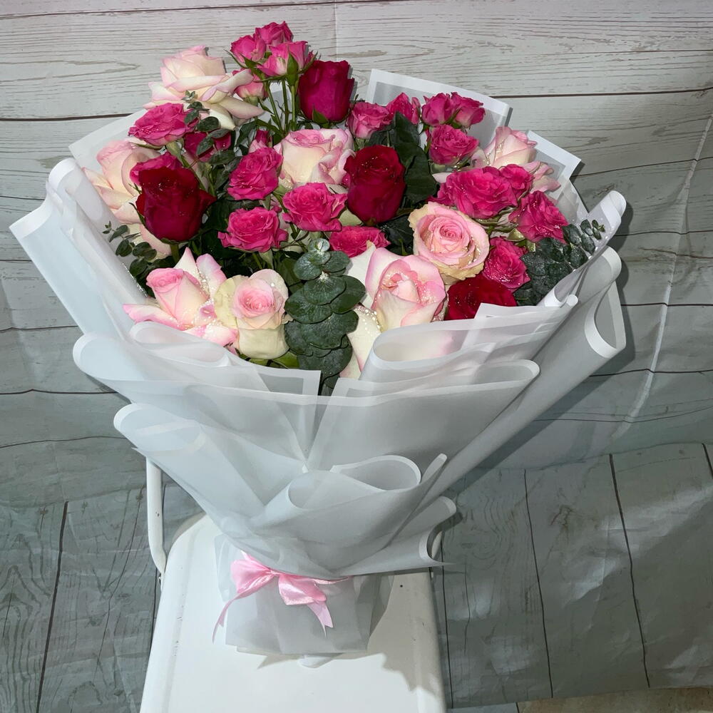 Украсьте свой особенный день великолепным сочетанием элегантности и романтики. Этот свадебный букет состоит из 17 пышных роз, создающих прекрасный контраст между 12 крупными розами и 5 очаровательными миниатюрными розами. Пять веток эвкалипта, чья успокаивающая зелень идеально оттеняет сияющие оттенки роз, добавляют нотку земли. Букет со вкусом упакован в 7 листов высококачественной бумаги и перевязан двумя изящными лентами, сочетая простоту и изысканность в каждой детали. Этот букет — не просто цветочная композиция; это произведение искусства, воспевающее вечную красоту и вечную любовь.