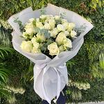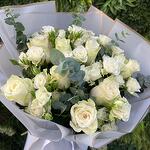 Этот изысканный букет сочетает свежие белые кустовые розы и великолепные белые розы, создавая вневременную и утончённую композицию.