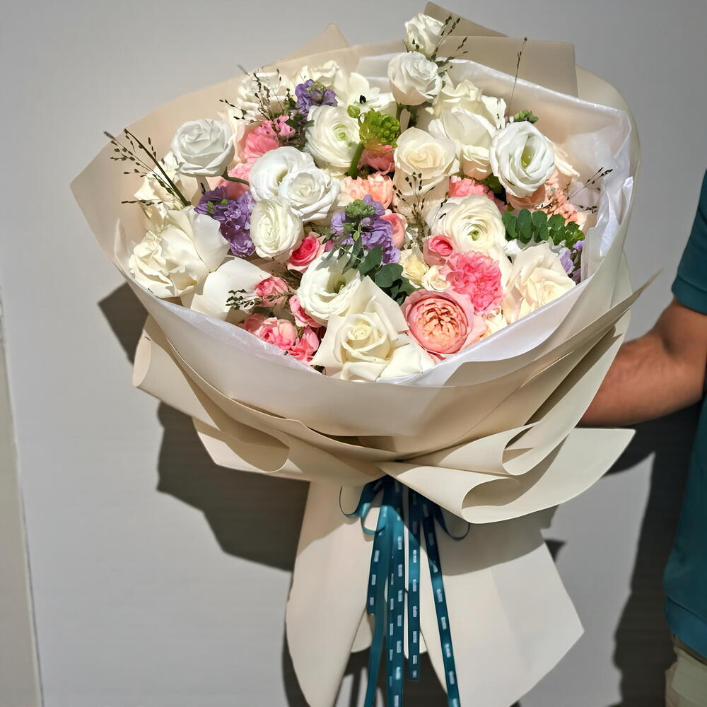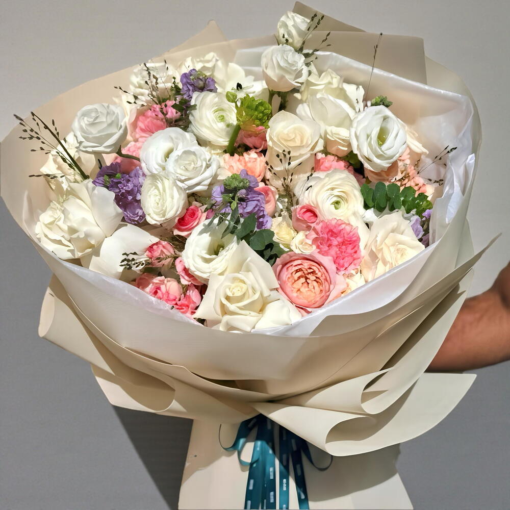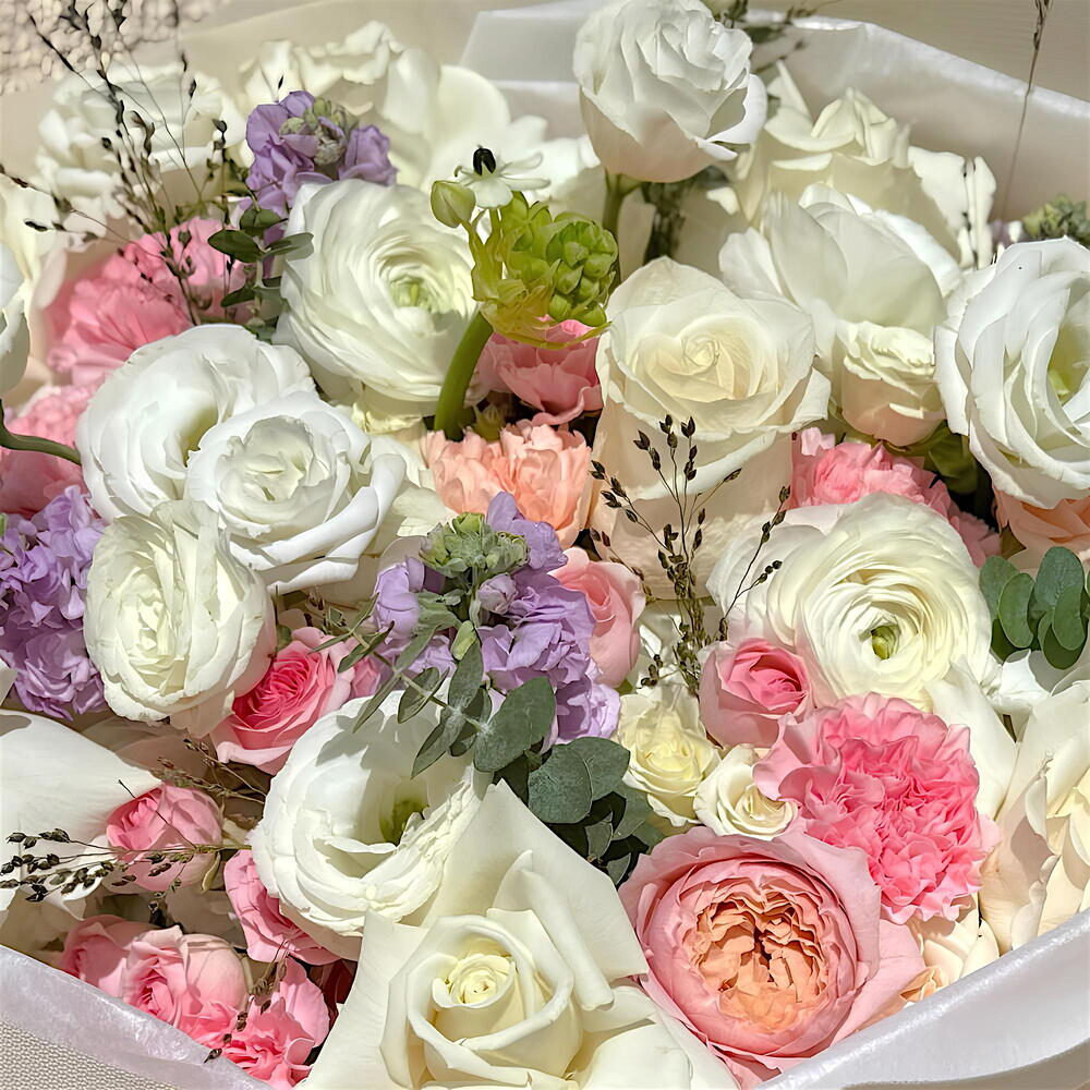 Шедевр, демонстрирующий нежную красоту персиковых роз сорта «Жульета», классических белых роз сорта «Вендела» и изысканную текстуру белых ранункулюсов. Глубокий, насыщенный фиолетовый цвет матиолы и лизиантуса создают потрясающий контраст, а метель и эвкалипт добавляют утонченности и экологичности. Букет собран вручную для захватывающего дух оформления. 🌸🩷 👑 Идеально подходит для девичников, юбилеев, юбилейных дат или в качестве изысканного корпоративного подарка.