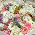 Eucalyptus - 6 шт. White rose - 5 шт. ranunculus white - 3 шт. pink spray rose - 3 шт. lisianthus white - 5 шт. white spray rose - 4 шт. white hydrangea - 3 шт. panicum - 4 шт. фиолетовая маттиола - 4 шт. розы вендела - 6 шт. Джульета персик - 3 шт.