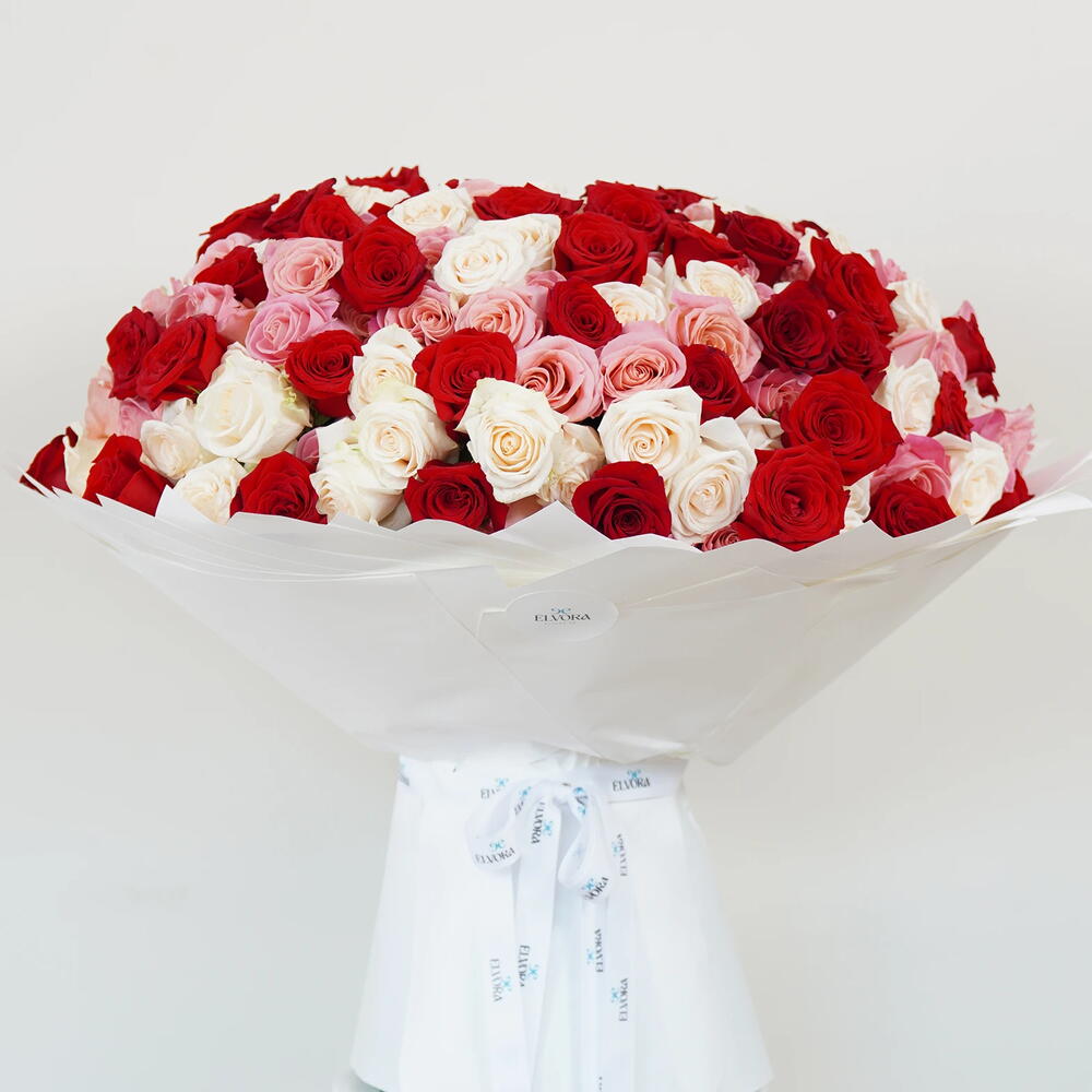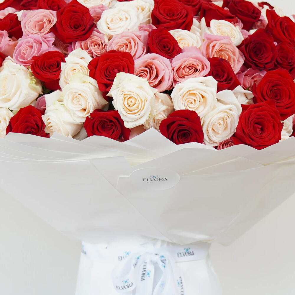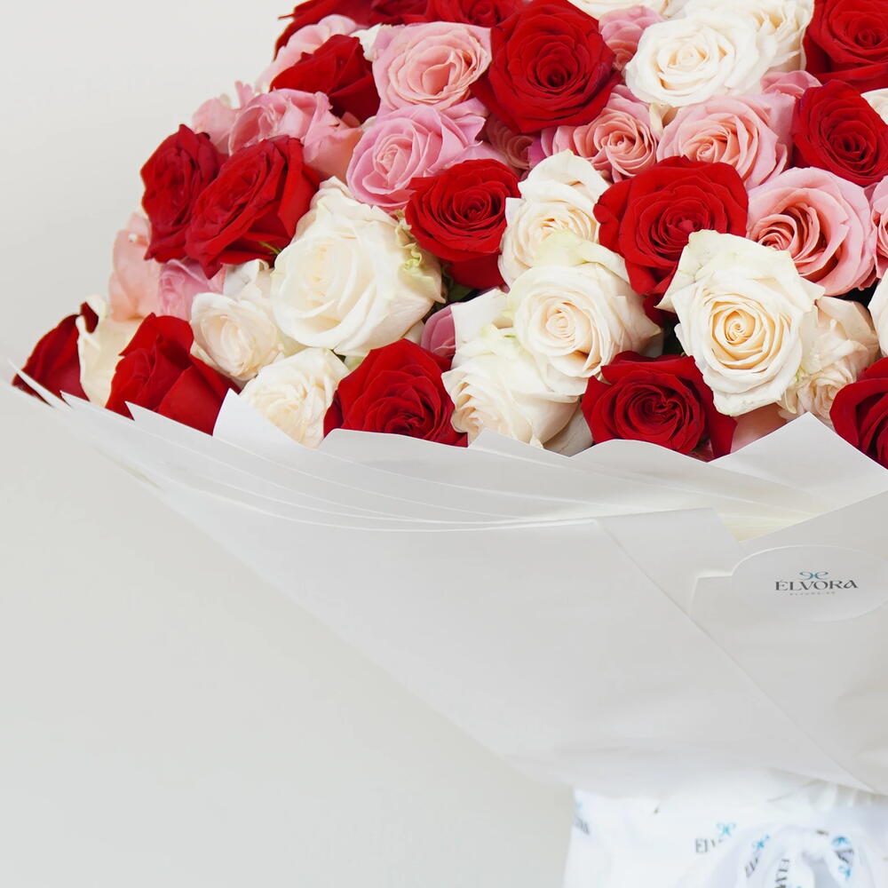 Букет «Преданность» из белых, красных и розовых роз — это диалог контрастов, где страсть встречается со спокойствием, а смелые эмоции соседствуют с тихой элегантностью. Темно-красные розы уверенно возвышаются, богатые и выразительные, а нежные кремовые и нежно-розовые цветы мягко переплетаются между ними, привнося баланс и тепло в эту историю. Каждая роза кажется продуманной, словно выбранной для выражения разных чувств: сильной любви, терпеливой любви и любви, которая длится вечно. Вместе они создают гармонию, которая кажется вневременной — никогда не кричащей, никогда не мимолетной. Этот букет не гонится за трендами; он твердо стоит на пути классической красоты, предназначенный для моментов, которые действительно важны. Роскошные цветочные композиции ко Дню святого Валентина, созданные для выражения любви.