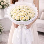 24 свежих белых роз, красиво оформленных в премиальную белую обёртку с элегантной лентой. Этот чистый и вечный букет создаёт изысканное впечатление для свадеб, в знак извинения, в знак сочувствия или по любому поводу, требующему утончённой элегантности.