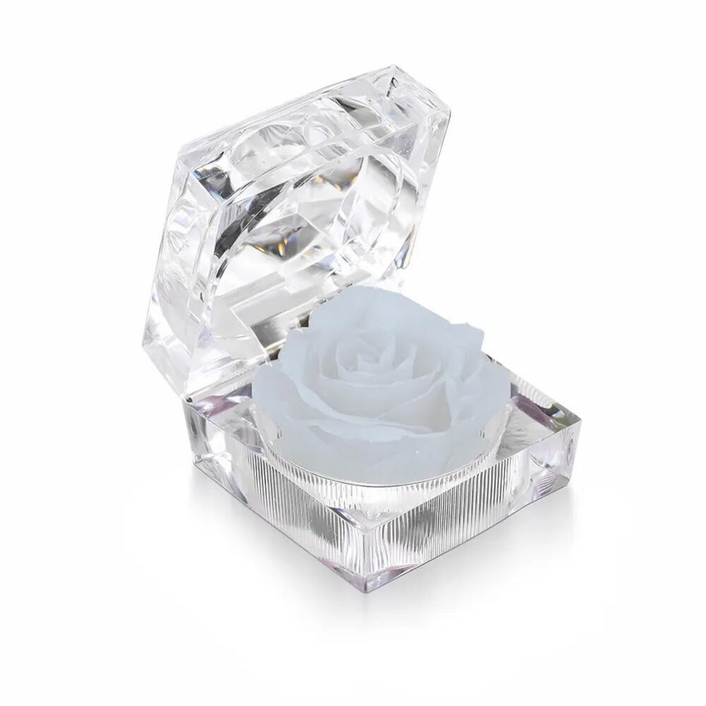Этот товар — настоящая стабилизированная роза, элегантно заключённая в прозрачную акриловую коробку с эффектом хрусталя, символизирующая вечную любовь и делающая её идеальной для любого особого момента.