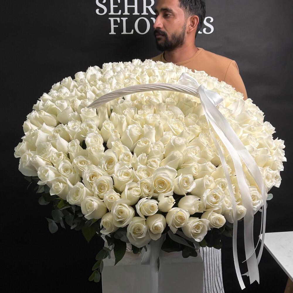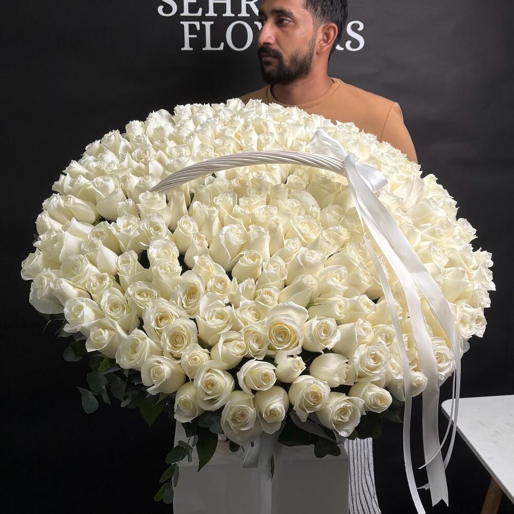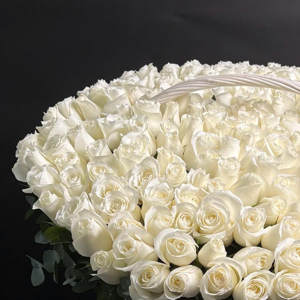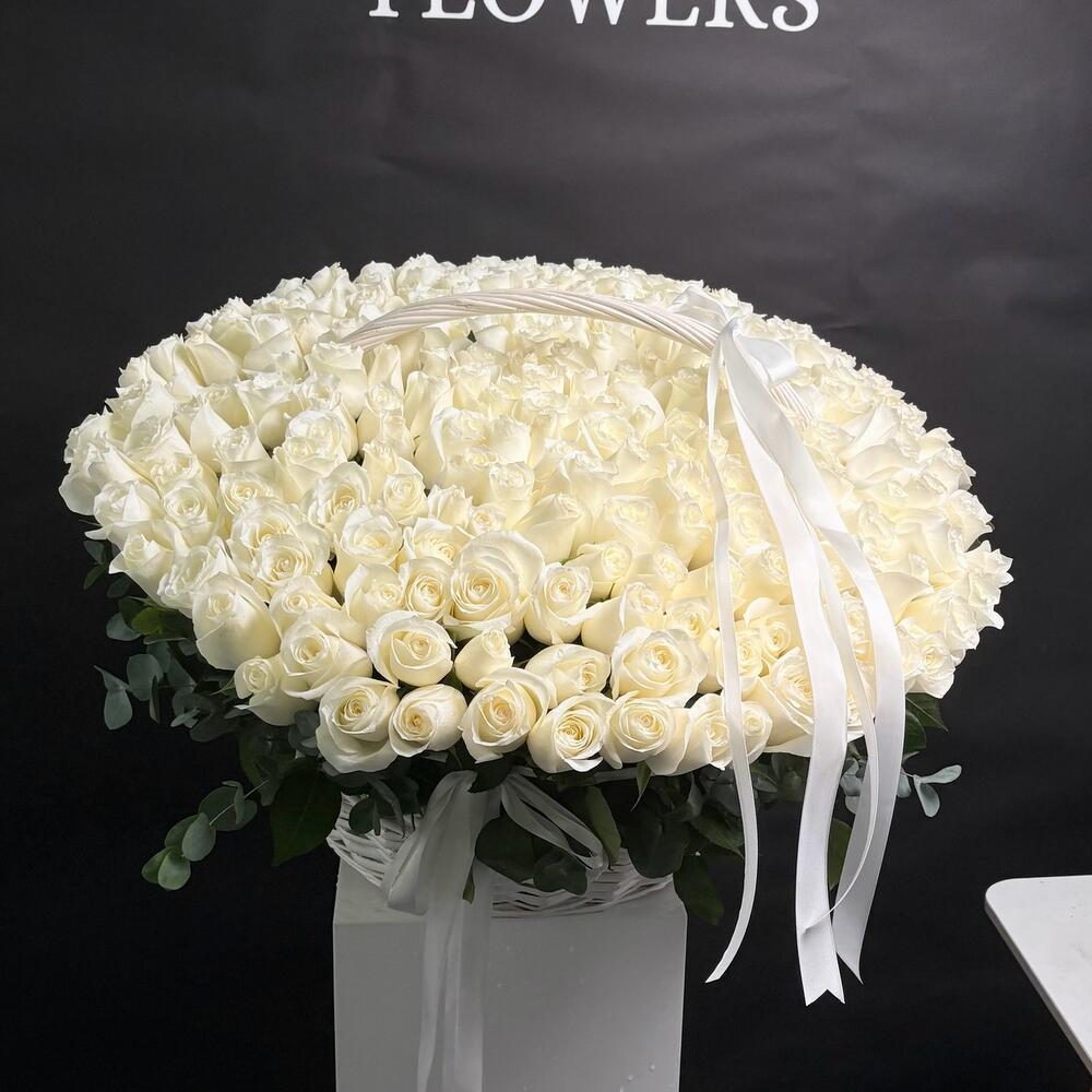 Элегантность в каждом лепестке 🤍 Великолепный жест любви и чистоты — эта захватывающая дух корзина из 200 свежих белых роз говорит о многом, не произнося ни слова. Идеально для свадеб, годовщин или незабываемых моментов.