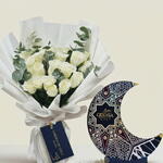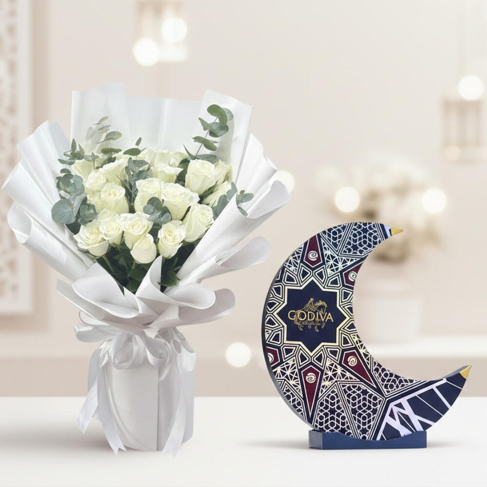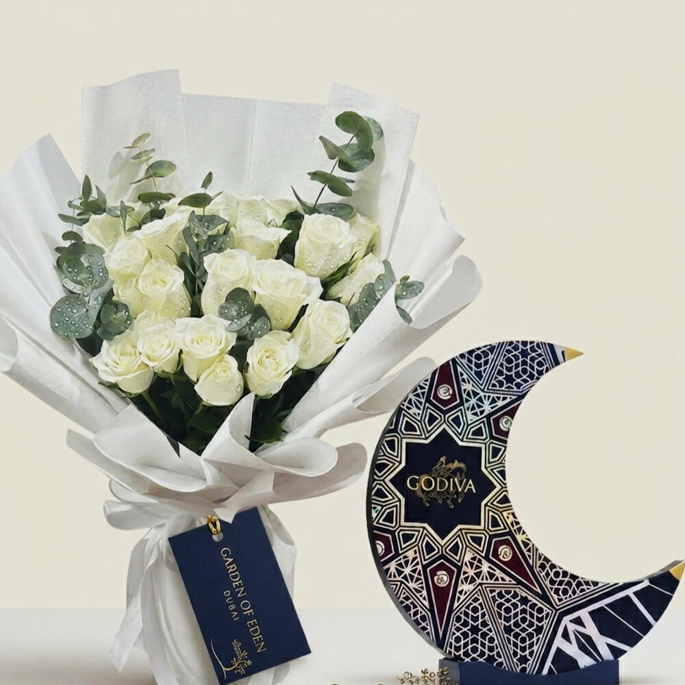 Отпразднуйте дух Рамадана элегантным букетом свежих белых роз в сочетании с лимитированной коробкой Godiva Crescent Moon Box. В комплект входят 24 вручную отобранные бельгийские пралине и трюфели — это роскошное сочетание гармонично объединяет традиции, элегантность и наслаждение.