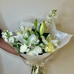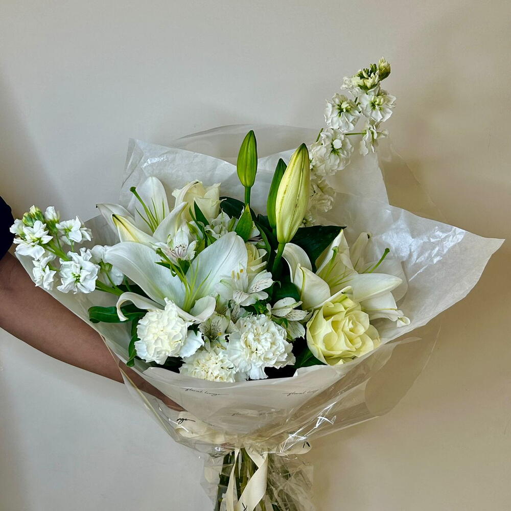 rose white - 3 шт. alstroemeria white - 3 шт. lily white - 3 шт. carnation white - 3 шт. маттиола белая - 2 шт.