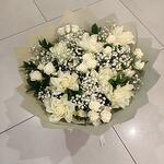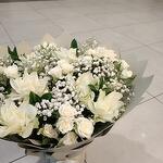 Красивый букет с Gypsophila paniculata, Gypsophila, садовыми розами, белыми лилиями и гвоздикой.