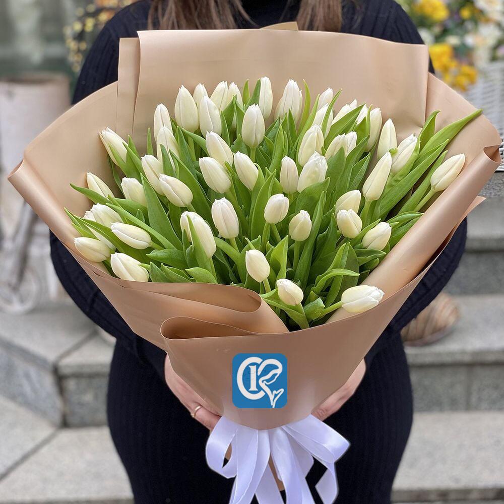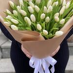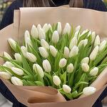 55 белых тюльпанов с упаковочной лентой