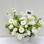 carnation white - 4 шт. tanacetum - 5 шт. mattiola white - 2 шт. белая ваза - 1 шт. микс лизиантусов - 4 шт. белая гербера - 5 шт. зелёный жезл - 5 шт.