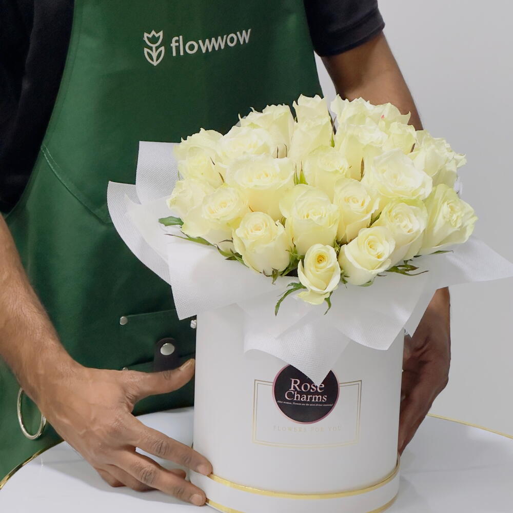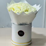 Окунитесь в чистоту и элегантность простоты с нашей потрясающей композицией из 25 безупречных белых роз, деликатно уложенных в стильную белую коробку.