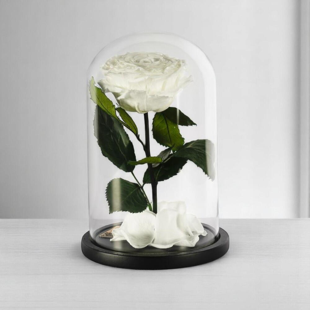 Уникальная стабилизированная роза с длинным стеблем, изящно заключенная в стеклянный купол. Розы – это натуральные, этично выращенные эквадорские розы, срезанные в расцвете сил и законсервированные натуральными маслами. Они сохраняют свою изысканную красоту не менее года, а при правильном уходе – до десяти лет. Эти розы не требуют полива и неотличимы от свежих.