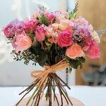 Этот очаровательный букет ручной сборки излучает элегантность и тепло благодаря восхитительному сочетанию розовых и персиковых оттенков. Свежие розы, хризантемы и альстромерии в сочетании с пышной зеленью создают идеальный баланс нежности и яркости. Букет перевязан рафией в рустикальном стиле, что придаёт ему натуральный и уютный вид. Это идеальный подарок, чтобы выразить любовь, благодарность или восхищение, делая любое событие незабываемым. Чтобы букет дольше оставался свежим, слегка подрежьте стебли под углом и поставьте их в чистую воду, обновляя её каждые 1–2 дня. Избегайте прямых солнечных лучей и сквозняков, чтобы цветы сохраняли свою красоту как можно дольше.