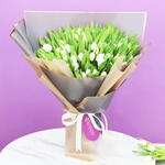 Описание товара 101 белый тюльпан Упакован в золотисто-коричневую и угольно-серую упаковку Перевязан белой лентой