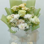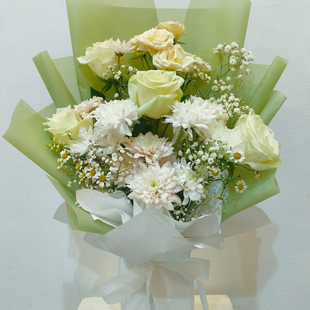 Насладитесь нашей подборкой Florists Specials — изумительным сочетанием элегантности и очарования. В центре этой композиции — четыре безупречно белые розы, придающие оттенок чистоты и любви. Дополняют их три изящные мини-розы, чьи нежные бутоны вносят в ансамбль тонкую грацию. Букет также украшен пятью снежно-белыми хризантемами и ещё четырьмя в контрастном оттенке, чьи яркие цветы олицетворяют красоту и долголетие. Девять жизнерадостных ромашек переплетаются с более эффектными цветами, их присутствие вызывает чувство невинности и нежности. В довершение этой элегантной композиции пять веточек гипсофилы создают иллюзию облака, их маленькие белые цветочки придают ощущение лёгкости и радости. Этот букет — прекрасный выбор подарка на любой случай, созданный, чтобы привнести глоток свежести и природной красоты в вашу повседневную жизнь.