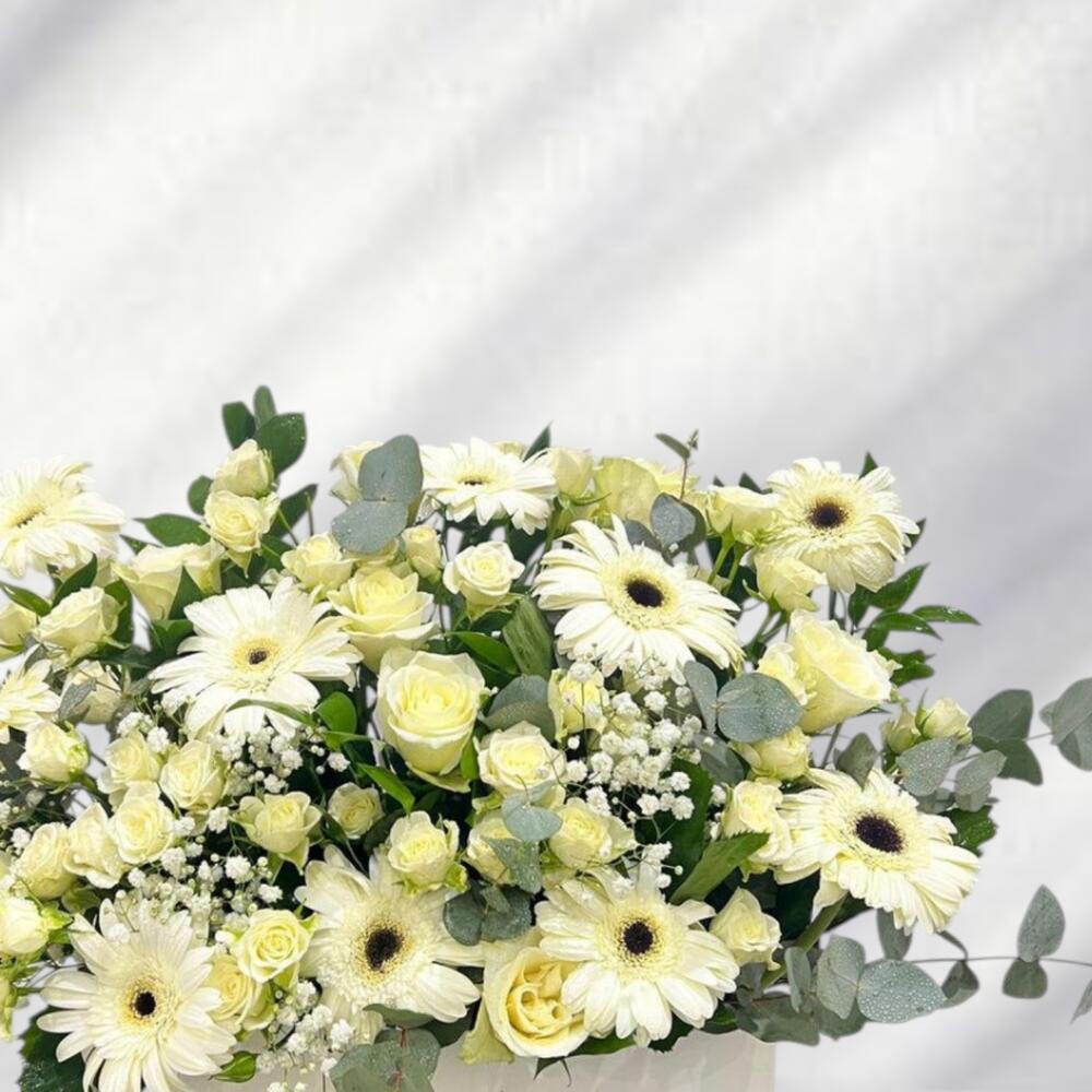 В букете присутствуют белые герберы, белые розы и небольшие цветы-наполнители, например, гипсофила (перекати-поле). В состав зелени входят листья эвкалипта, которые обычно используются для придания букетам текстуры и контраста. Белые цветы могут символизировать чистоту, невинность и новое начало. Белые герберы особенно олицетворяют невинность и чистоту, что делает их подходящими для таких случаев, как рождение ребенка. Перекати-поле часто символизирует чистоту, невинность и вечную любовь, что делает его популярным выбором для свадеб.