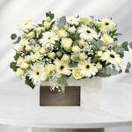 white box - 1 шт. белая гипсофила - 8 шт. eucalyptus leaves - 10 шт. white roses - 10 шт. белые спрей-розы - 15 шт. белые герберы - 21 шт.