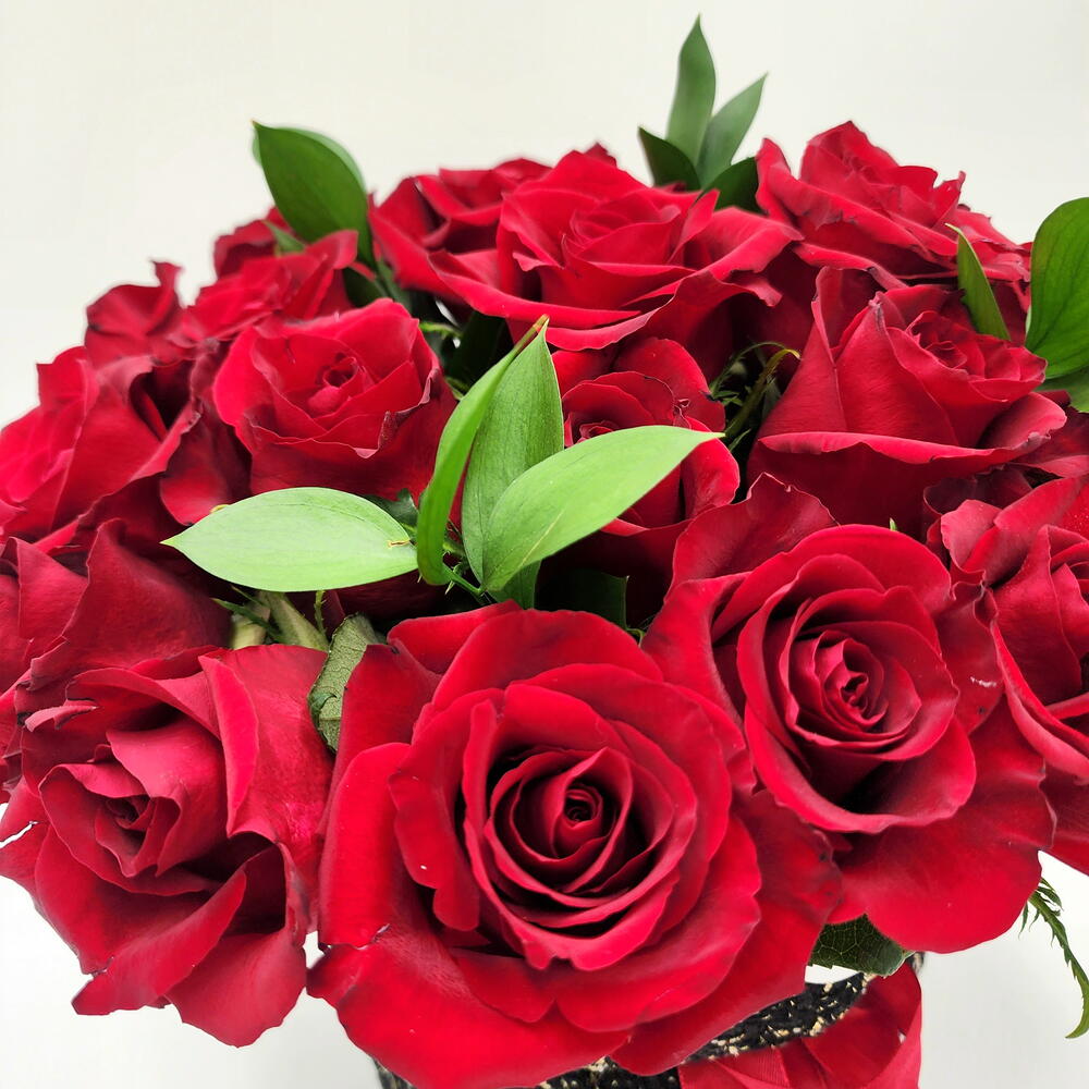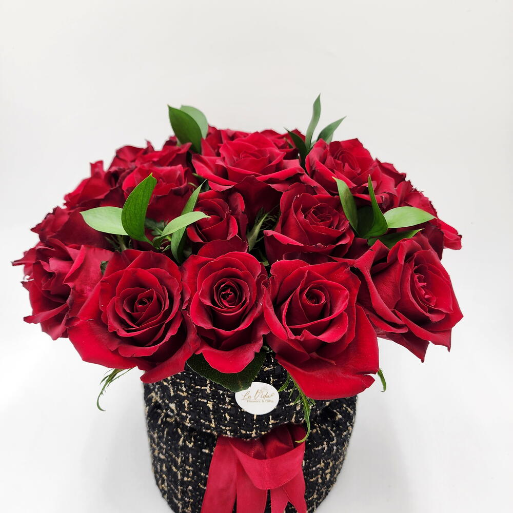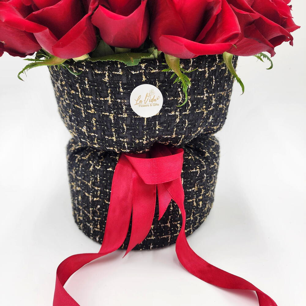 Отпразднуйте День святого Валентина с этим элегантным букетом. 20 свежих красных роз, красиво упакованных в черно-золотую тканевую упаковку.