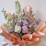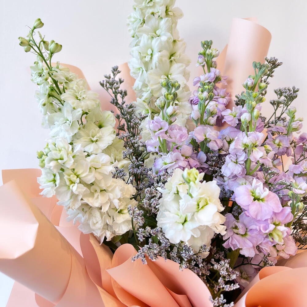 лимониум пурпурный - 4 шт. дельфиниум белый - 4 шт. маттиола фиолетовая - 7 шт.