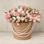 Эта эксклюзивная корзина к Женскому дню создана, чтобы воплотить элегантность, силу и вечную красоту. Роскошная композиция из нежных розовых и слоновой кости тюльпанов, аккуратно уложенных в натуральную корзину ручной работы, украшенную ниспадающими нитями жемчуга — символ утончённости и женственности. Каждый стебель отобран по свежести и форме, создавая нежное, но в то же время выразительное присутствие, которое озаряет любое пространство. Нежное сочетание пастельных оттенков отражает восхищение, благодарность и признательность женщинам, которые вдохновляют нас каждый день. Цена — AED 2000; эта лимитированная композиция создана для тех, кто хочет подарить что-то по-настоящему запоминающееся — изысканное, грациозное и несомненно особенное. Потому что некоторые женщины заслуживают только необыкновенного.