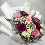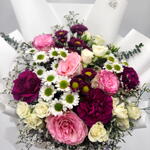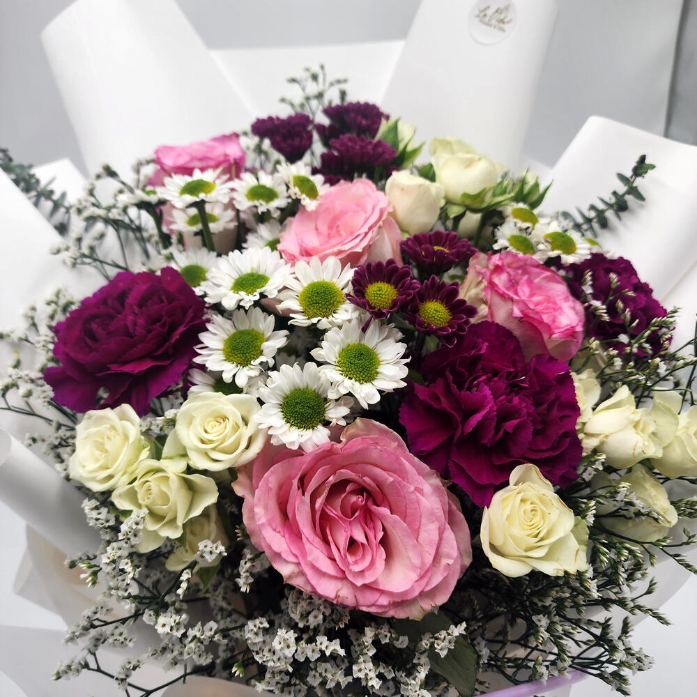 Это изысканный монобукет, который с легкостью выражает сдержанную элегантность. Окутанный слоями очаровательных розовых махровых роз (4 шт.) в сочетании с тихой грацией фиолетовых гвоздик (3 шт.), он демонстрирует художественное равновесие цвета и текстуры. Эту симфонию цветов дополняют безупречные белые мини-розы (3 шт.) и хризантемы Regan (5 шт.), придающие букету утонченность. Непреходящее очарование лимониума чистого белого цвета (3 шт.) и освежающая атмосфера листьев эвкалипта (2 шт.) прекрасно сочетаются с цветами, усиливая приятный визуальный эффект. Впустите спокойствие природы в свой дом с этим прекрасным букетом, полным текстуры, цвета и стиля. Корзина с цветами ко Дню женщин Букет ручной работы ко Дню женщин Цветочная коробка Цветочная композиция в вазе ко Дню женщин Роскошные цветы для нее Недорогие цветы ко Дню женщин Доставка в тот же день ко Дню женщин