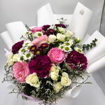 eucalyptus leaves - 2 шт. белая мини-роза - 3 шт. фиолетовая гвоздика - 3 шт. лимониум белый - 3 шт. розовая двухцветная роза - 4 шт. хризантема реган - 5 шт.
