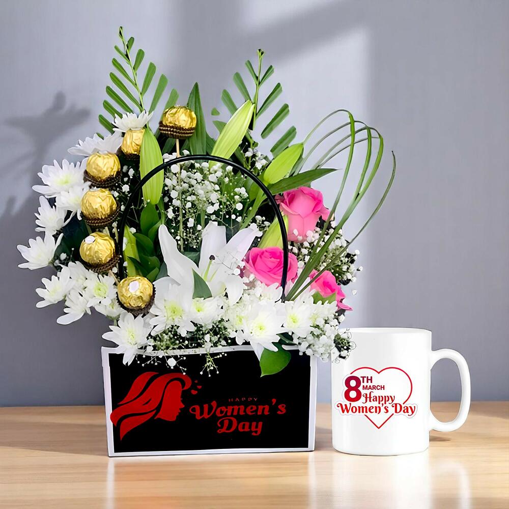 Ferrero rocher - 6 шт. Pink rose - 3 шт. white chrysanthemum - 2 шт. lilly - 1 шт. кружка к женскому дню - 1 шт. женская повседневная сумка - 1 шт.