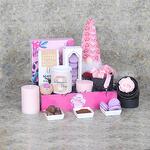 1 розовая роза Forever в черной коробке, 16 шоколадных конфет премиум-класса Sweecho ко Дню женщин (Women's Day), 1 милая мягкая игрушка 30 см, 100 г арабского кофе, кружка для кофе ко Дню женщин, 5 черничных макарон премиум-класса, 1 ароматическая свеча-столбик, 1 бомбочка для ванны, все в розовом акриловом подносе.