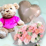 Комбо из букета из премиальных смешанных цветов, милого медвежонка высотой 10 см, фольгированного шара в форме сердца бежевого цвета, наполненного гелием