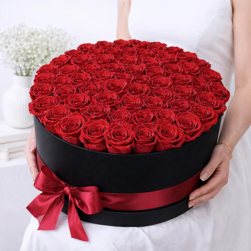 101-121 Красные розы Уложены в круглую чёрную коробку XXL Красный бант