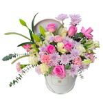 White rose - 8 шт. Lilies - 3 шт. white box - 1 шт. cornations - 5 шт. pink roses - 7 шт. эвкалипт - 4 шт. хризантема розовая - 8 шт.